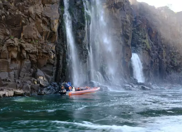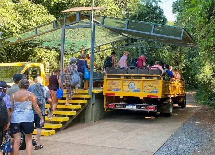 Het eerste deel van de tocht gaat per 4WD bus door de jungle over een 5 km lange grindweg naar de haven. Vanaf hier leidt een steile trap naar beneden naar de haven, waar een speedboot klaarligt om je over de rivier naar de bulderende watervallen te brengen.