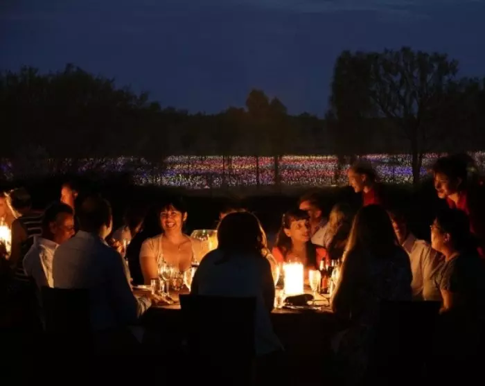 De avond begint met een glaasje bubbels tijdens zonsondergang, terwijl de lichtjes één voor één zelf aangaan. In zekere zin is het altijd een beetje weemoedig om de zon achter Uluru te zien ondergaan, maar vandaag wacht een beloning. Geniet van een driegangendiner, geserveerd in buffetvorm, voordat je een wandeling maakt in de Fields of Light. Houd er rekening mee dat het diner plaatsvindt aan grote tafels met ongeveer 10 gasten per tafel.
