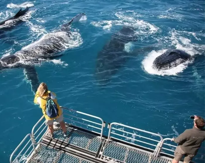 Een speciaal gebouwde catamaran met plaats voor maximaal 80 personen zorgt voor een intense ontmoeting met de walvissen. De catamaran heeft zowel onderwaterramen als een platform op zeeniveau, zodat je de walvissen zowel boven als onder water kunt zien.