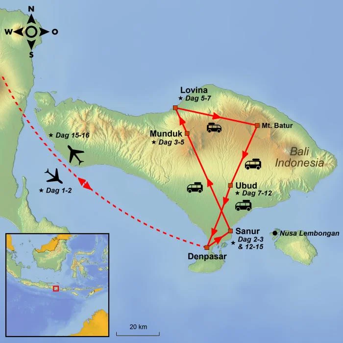 De reis begint met een nacht in de badplaats Sanur, waar u kunt relaxen na de lange vlucht en kunt wennen aan het tijdsverschil en de warmere temperaturen.