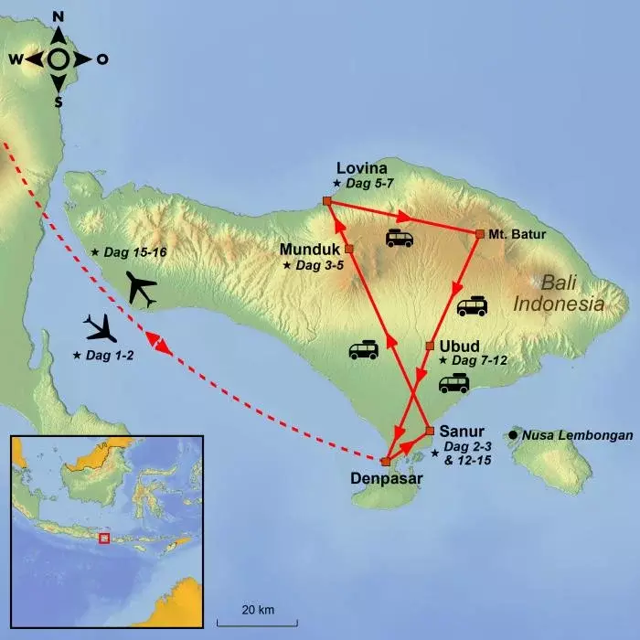 Ontdek de weelderige hooglanden van Munduk en maak kennis met het dorpsleven in Rumah Desa. Laat u verleiden door de charme van Ubud en bekijk de prachtige rijstterrassen van Tegalalang. In de badplaats Sanur kunt u alles op u laten inwerken.