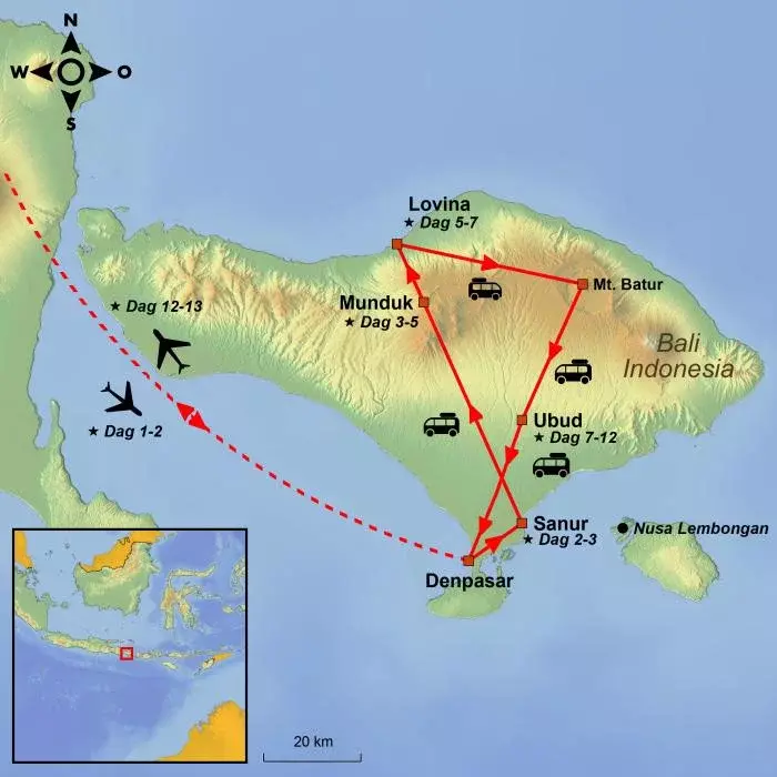 U landt op Ngurah Rai, de internationale luchthaven van de hoofdstad Denpasar. Bij aankomst gaat u door de immigratie, waar u een toeristenvisum krijgt en daarna haalt u uw bagage op. In de aankomsthal wacht uw vriendelijke gids met een TourCompass-bordje, en u krijgt meteen een warme Balinese verwelkoming.