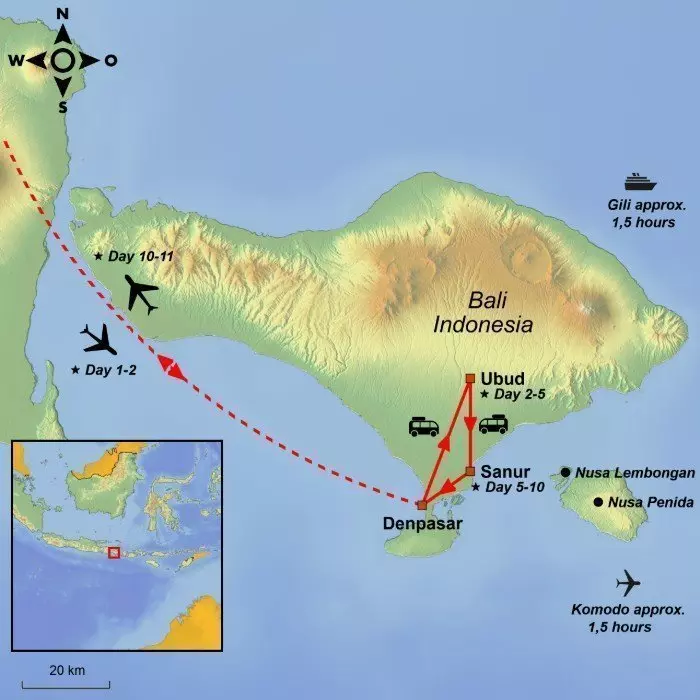 De reis begint in het charmante en betoverende kunstenaarsdorp Ubud, prachtig gelegen in het hoogland van Bali en omgeven door grasgroene rijstvelden, rivieren en heilige tempels. Ubud is ook het culturele hart van Bali, waar ceremoniële processies en tradities in ere worden gehouden. De rest van de dagen zijn ter vrije besteding. U kunt bijvoorbeeld een aantal boeiende excursies bijboeken.