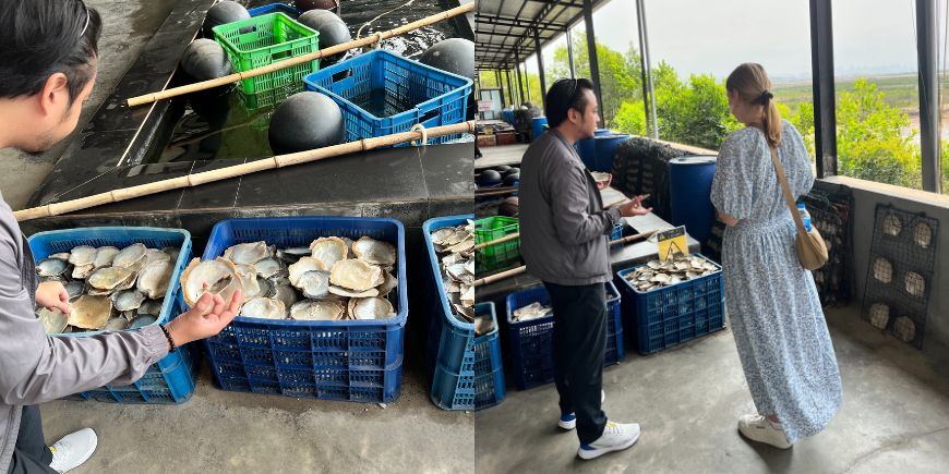 Voordat we bij de Ha Long-baai en ons drijvende hotel aankwamen, maakten we een stop bij een oesterkwekerij. Louisa en ik hadden de dag ervoor al geconstateerd dat Hai echt een geweldige gids is en dat werd vandaag weer bevestigd. Terwijl hij over de oesterkwekerij en de werknemers vertelde, sloten steeds meer mensen zich bij onze groep aan om naar Hai te luisteren. Opeens stond er een hele groep mensen om de gids heen, die rustig doorging met vertellen, maar wel met een schalkse glimlach om de lippen.