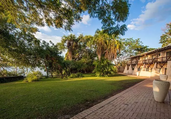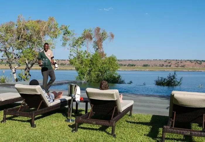 Aan de andere kant van de receptie wacht het uitgestrekte gazon, dat doorloopt tot aan de Chobe-rivier, waar de nijlpaarden er overdag en ‘s nachts lustig op los brullen.
