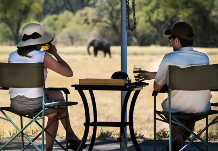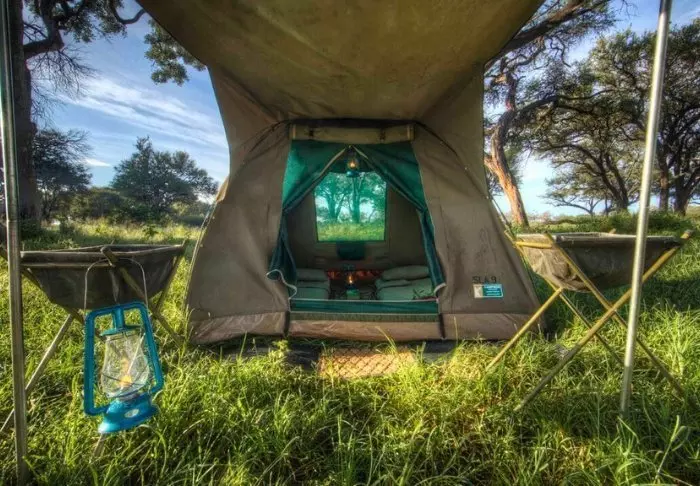Buiten de tent is een kleine schaduwrijke luifel met stoelen, zodat je kunt genieten van het uitzicht op de natuur om je heen. Je slaapt op een comfortabel vouwbed met een lekker zacht matras, echte dekbedden en kussens en een klein nachtkastje. In het verlengde van je tent heb je je eigen bushbadkamer met douche en toilet. De tent heeft geen elektriciteit of stromend water, en de doorspoelfunctie van het toilet bestaat uit een hoopje aarde en een klein schepje – maar er IS wel een toilet! Meerdere keren per dag krijg je warm water en kun je je wassen in een kleine wasbak die in een rek buiten de tent staat. Als je de film ‘Out of Africa’ hebt gezien, weet je precies hoe het werkt. ‘s Middags wordt er water verwarmd en omhoog getakeld in een emmer met een douchekop eronder, zodat je lekker warm kunt douchen. Het is primitief, maar comfortabel, en het belangrijkste: het is overnachten op de voorwaarden van de natuur zelf, waarbij je geen sporen achterlaat terwijl je de wilde dieren in de delta van dichtbij meemaakt.