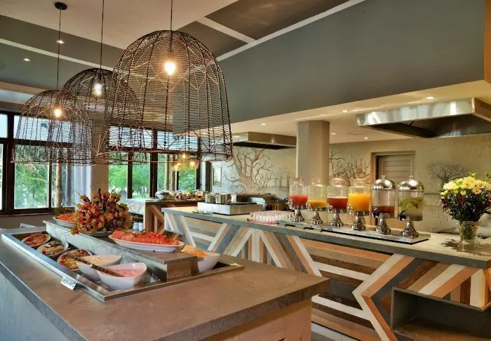 Het restaurant biedt zowel à la carte gerechten als een buffet en het eten is heerlijk en wordt bereid met lokale ingrediënten.