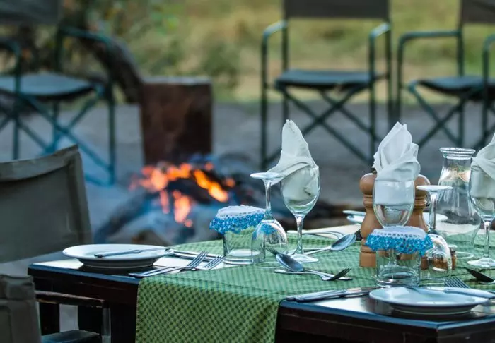 Je eet onder de sterrenhemel en het eten is goed! Vers gemaakt, smaakvol en voedzaam – je krijgt echt trek als je op safari bent. Natuurlijk wordt er koud bier en wijn geserveerd bij het eten, als je dat wilt, en er staat de hele dag thee en koffie klaar.