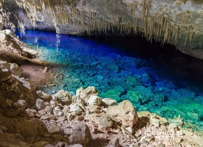 Ervaar de schitterende grot Gruta do Lago Azul, bekend om het heldere turquoise blauwe water en de druipsteenformaties.