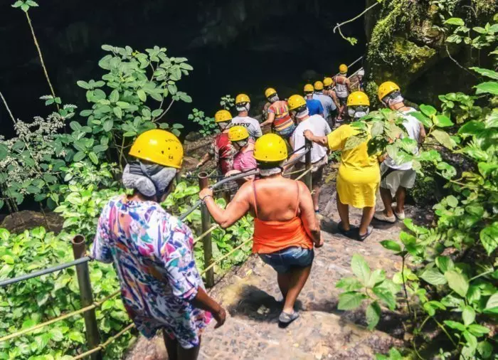 Tijdens de tour loop je met een kleine groep en een gids 300 meter naar beneden via steile trappen, die uit de kalksteenrots van de grot zijn gehouwen. Onderweg zijn er pauzes waarin je de prachtige grot kunt bewonderen, terwijl de gids je vertelt over de verschillende geologische formaties die er te vinden zijn: stalactieten, stalagmieten en vele andere kalksteenafzettingen. Aan de voet van de treden ligt een plateau waar je de schitterende omgeving goed in je op kunt nemen en prachtige foto’s kunt maken. Het meer in de grot is op het diepste punt meer dan 80 meter diep en bevat zeldzame albinogarnalen, maar ook botten van sabeltandtijgers en reuzenluiaards die meer dan 12.000 jaar geleden in de regio leefden.