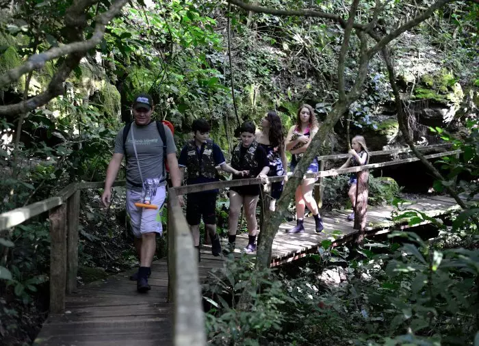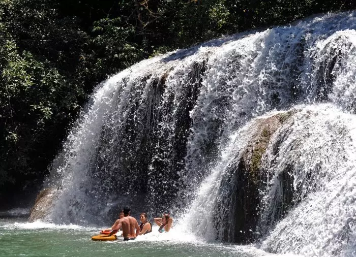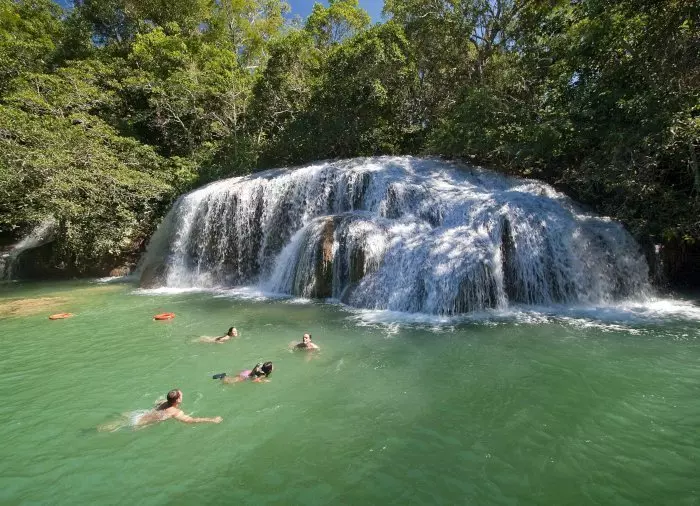 waarna je wordt meegenomen op een begeleide wandeling door het weelderige bos rond de Rio Mimoso, langs 9 watervallen van verschillende vormen en groottes. Onderweg kun je zwemmen onder de watervallen en in natuurlijke bassins, kleine grotten verkennen en uitkijken over de Serra da Bodoquena met zijn watervallen en bergen die de vallei rond de rivier de Mimoso vormen. Als je lef hebt, kun je van een 6 meter hoge brug in een natuurlijke waterpoel springen. Op sommige stukken kun je ook een korte boottocht maken en ontspannen terwijl je van de omgeving geniet.
