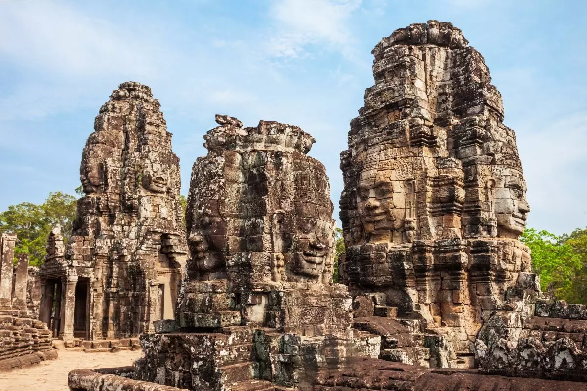Verderop ziet u Bayon, een van de hoofdtempels en heel indrukwekkend met een groot aantal lachende Boeddha-gezichten.