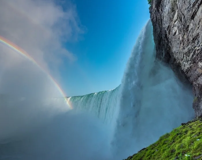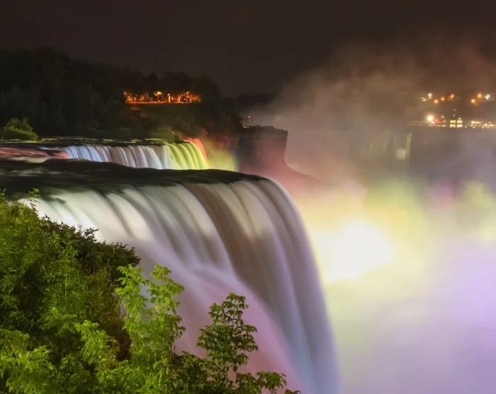 U weet dat u de juiste richting uitloopt als het geluid steeds luider wordt. Plots staat u daar – recht aan de rand van de machtige Niagara Falls. Komt u tijdens de schemer aan, dan ziet u het water verlicht in een schitterend kleurenpalet.
