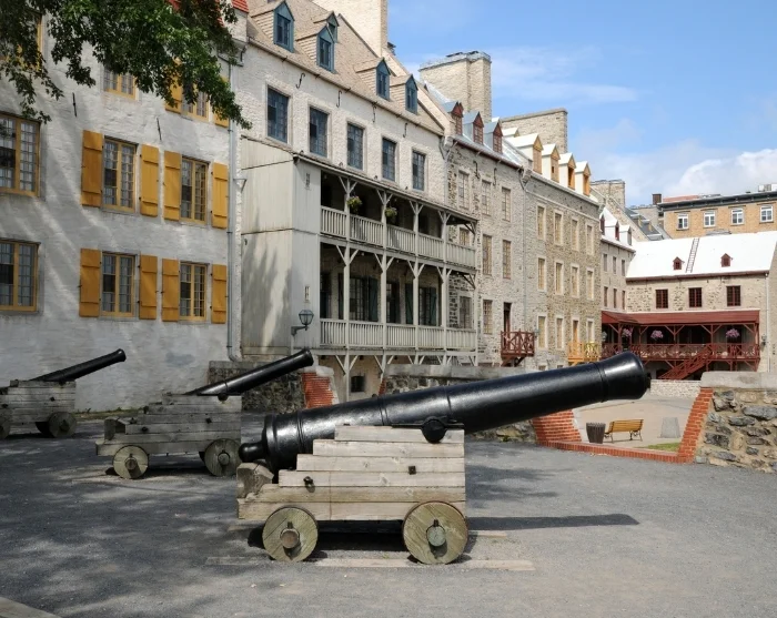 Uw wandeling begint op Place Royale, waar de stad in 1608 werd gesticht. Van hier loopt u langs de oudste kerk van Canada, de Notre-Dame-de-Québec Basilica-Cathedral, en verder naar het indrukwekkende Château Frontenac hotel, dat hoog boven de stad uittorent en menig hoek domineert. Vanaf de Dufferin Terrace geniet u van een schitterend uitzicht over de St. Lawrence rivier—een stille getuige van het militaire verleden van Québec. In 1759 voeren Britse troepen de stad binnen en beslisten zij de beroemde veldslag op de Plaines of Abraham in hun voordeel. In 1763 werd Frans Canada formeel aan Groot-Brittannië overgedragen.