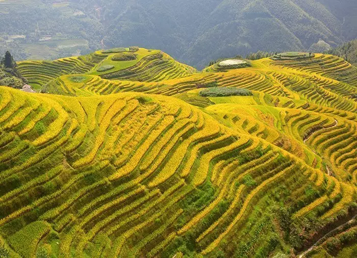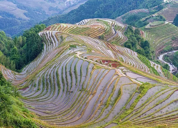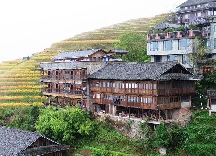 Ping’an is beroemd vanwege de prachtige ligging midden in de prachtige rijstterrassen van Longji, die zich uitstrekken tot zover het oog reikt. Longji betekent ‘rug van de draak’, en dat is precies hoe de heuvelachtige rijstterrassen eruit zien. Het is niet moeilijk te begrijpen waarom deze rijstterrassen worden beschouwd als de mooiste ter wereld, en waarom ze dichters, fotografen en toeristen van heinde en verre aantrekken. Ze zijn gigantisch, betoverend en indrukwekkend! Lang geleden waren het de voorouders van de Zhuang die deze terrassen hebben aangelegd. Ze liggen tegen de steile berghellingen aan op een hoogte van 300-1100 meter.