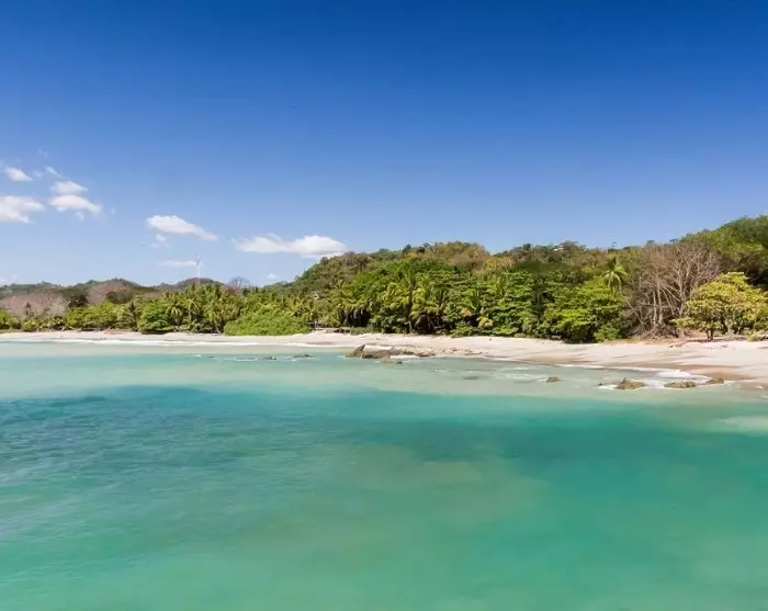 De tour eindigt aan de Pacifische kust van Costa Rica aan het prachtige zandstrand Playa Sámara, omgeven door wuivende palmbomen.