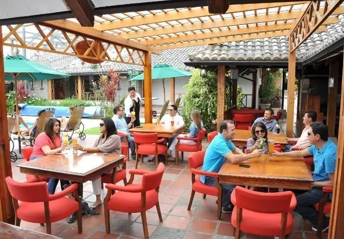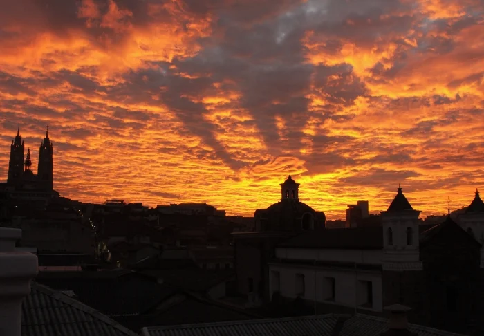 Na een interessante dag in Quito kun je ontspannen in het kleine loungegedeelte van het hotel of op het buitenterras waar je kunt kijken hoe de zon ondergaat achter de bergen.
