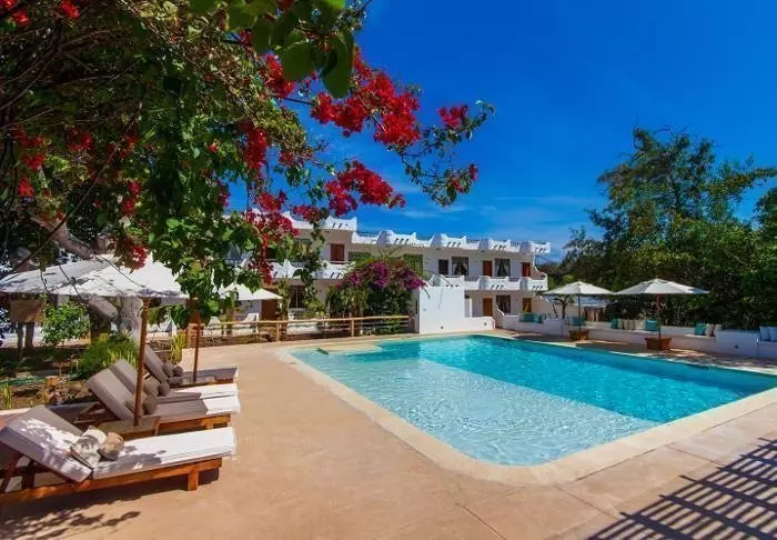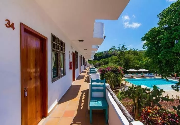 Het hotel heeft vier verdiepingen (geen lift) en heeft slechts 19 kamers rond een binnenplaats met een klein zoutwaterzwembad, waar je kunt genieten van een duik na een dag vol avontuur op het eiland.