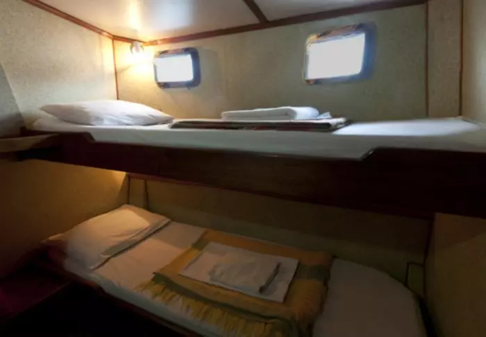 De boot heeft slechts 8 hutten, geschikt voor 16 passagiers op 3 dekken. De hutten zijn klein met stapelbedden, maar hebben allemaal hun eigen toilet en airconditioning. We gebruiken de hutten op het midden- en bovendek waar het motorgeluid het minst is.