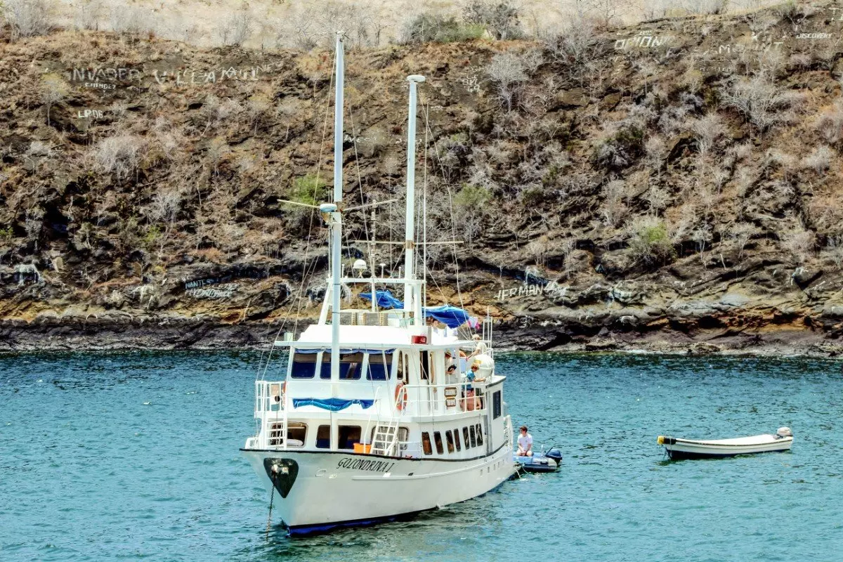 Je geniet van de lunch terug op het schip en terwijl je eet en ontspant, vaart de boot langzaam verder naar je volgende stop op Isabela. Je stopt bij Tagus Cove, dat ooit een populaire locatie was voor walvisvaarders en piraten. Velen van hen schreven de namen van hun schepen op de rotswanden rond de baai, en vandaag de dag kun je nog steeds veel van de namen op de rotsen zien.
