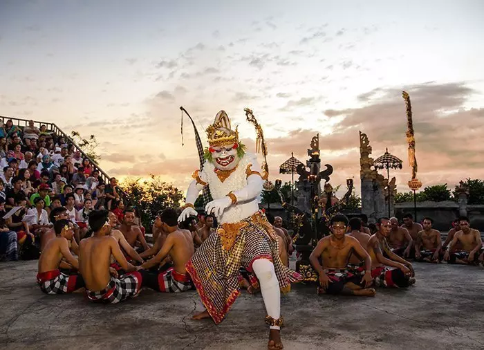 In de schemering van de zonsondergang wordt de traditionele Balinese Kecak-dans uitgevoerd door een grote groep mannelijke dansers. De beroemde Balinese dans verbeeldt het oude verhaal van koning Rahwana die Sita gevangen neemt, de vrouw van Rama. De dans toont de strijd tussen Rahwana en Hanoman, de leider van de apen.