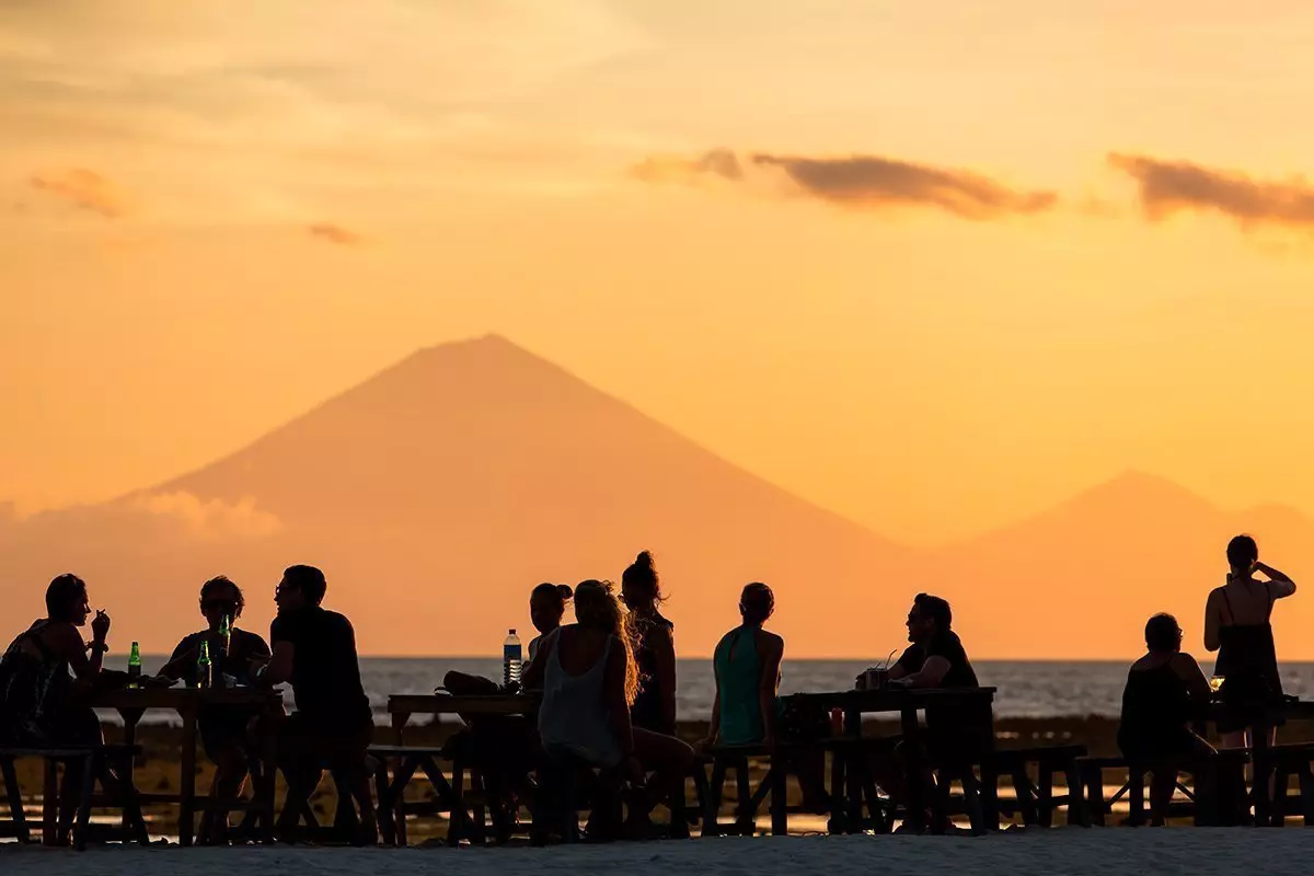 De reis gaat verder naar Gili Trawangan, een van de drie Gili-eilanden. Gili Trawangan is vooral populair vanwege de stranden en de goede duik- en snorkelmogelijkheden, en u kunt hier zeeschildpadden zien. ‘s Avonds kunt u ontspannen in een zitzak en genieten van een drankje terwijl de zon ondergaat achter de vulkaan Mt. Agung op Bali.