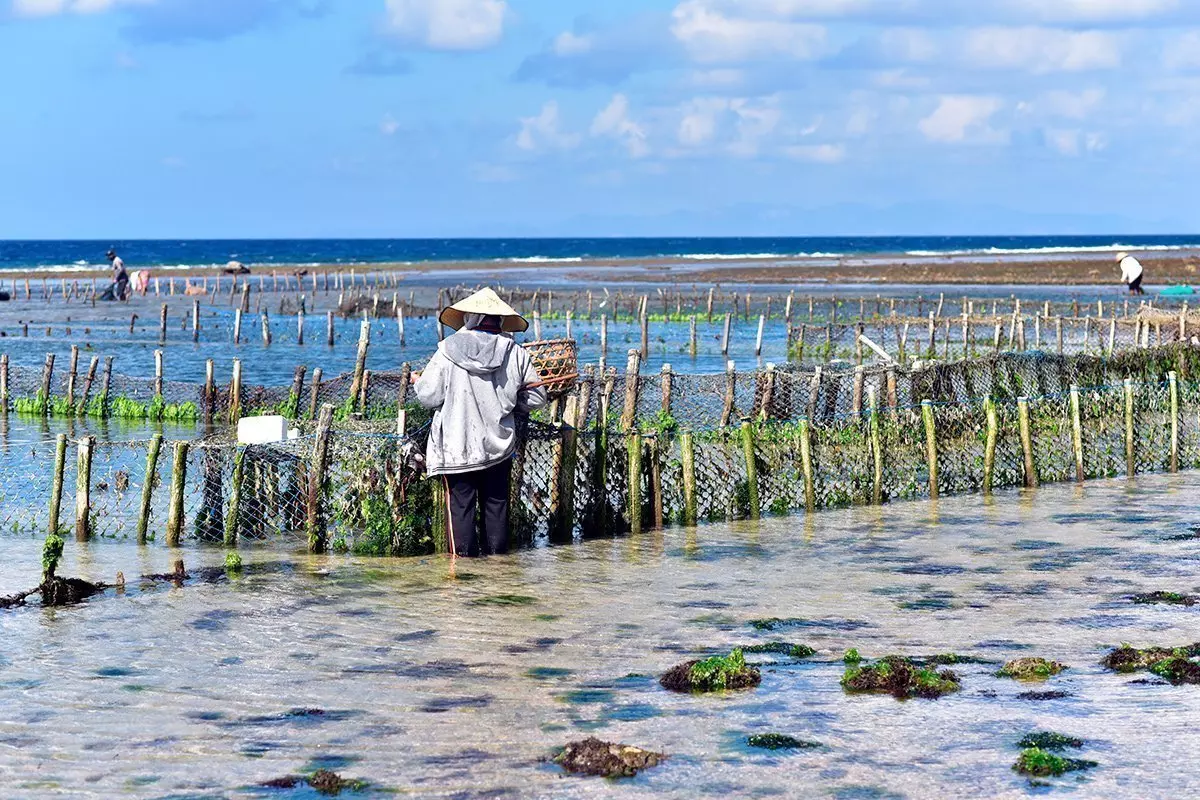 Veel bewoners van het eiland verdienen hun brood met het kweken van zeewier. Bij eb komen de zeewiervelden tevoorschijn en staan de boeren in het enkelhoge water om de oogst van de dag te plukken. Ze leggen het zeewier in grote rieten manden, die ze naar land dragen, en waar ze het te drogen leggen in de zon.