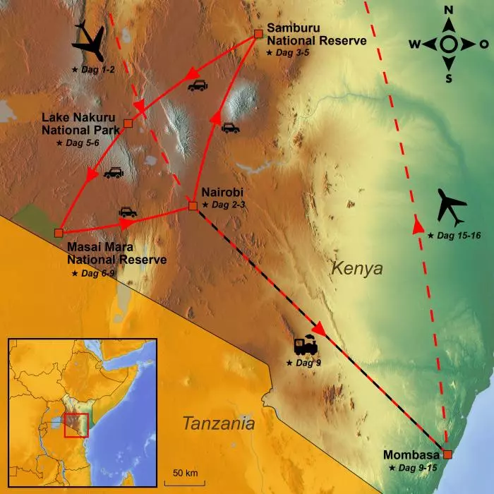 U kruist de evenaar en kunt heel dicht bij het fascinerende en gevarieerde dierenleven in de nationale parken Samburu en Masai Mara komen. In laatstgenoemde staan de karakteristieke acaciabomen die de dieren schaduw geven. U rijdt door het prachtige landschap bij de 5.000 km lange Great Rift Valley met watervallen, vulkaankraters en het Lake Nakuru National Park, dat bekend staat om nijlpaarden en flamingo’s.