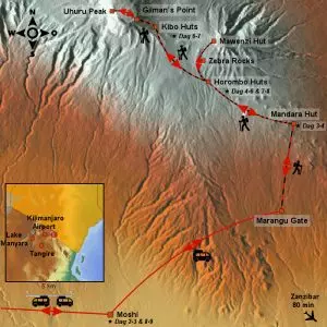 De Marangu-route is ook bekend als de Coca Cola-route. De route begint bij Marangu Gate, de zuidoostelijke ingang van Nationaal Park Kilimanjaro. U wandelt over prachtige paden door bos en regenwoud. Het landschap verandert in heidelandschap en de gigantische senecio-planten worden zichtbaar. Onderweg kunt u genieten van het uitzicht op de Kibo en de bergtoppen van de Mawenzi. We hebben een acclimatisatiedag ingelast zodat u beter aan de hoogten kunt wennen. U kunt deze dag eventueel naar Maweni Tarn Hut of Zebra Rocks wandelen. Het heidelandschap verandert geleidelijk in het alpien woestijnlandschap dat de Mawenzi en de Kibo met elkaar verbindt. U wandelt langs Gilman’s Point waar u van het uitzicht op de top kunt genieten. Het bestijgen van de top vindt vanuit het oosten plaats. Het afdalen vindt aan de zuidoostelijke zijde van de berg plaats. U komt langs veel punten met uitzicht op de Kilimanjaro.