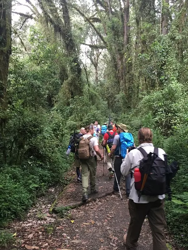Na het ontbijt verlaat u Moshi en rijdt naar Marangu Gate, de zuidoostelijke ingang van Nationaal Park Kilimanjaro – 45 minuten rijden. Bij aankomst bij Marangu Gate vindt het inchecken en registreren plaats. Dit is ook de plaats waar u uw team van gidsen, koks en dragers ontmoet. Hier begint de beklimming naar de top van de Kilimanjaro. U wandelt over mooie paden door bos en regenwoud waar u eucalyptusbomen, verschillende vogelsoorten en met een beetje geluk de zwart-witte Colobus-apen kunt zien. Op deze lage hoogten kan het nat en modderig zijn, dus het is belangrijk dat u de juiste uitrusting hebt, vooral geschikt schoeisel. Bij aankomst bij Mandara Hut is het tijd voor ontspanning. Als u er zin in heeft en er animo voor is, kunt u samen met de gids en anderen een wandeling naar Maundy Crater maken en de omgeving verkennen, terwijl de koks het eten bereiden.