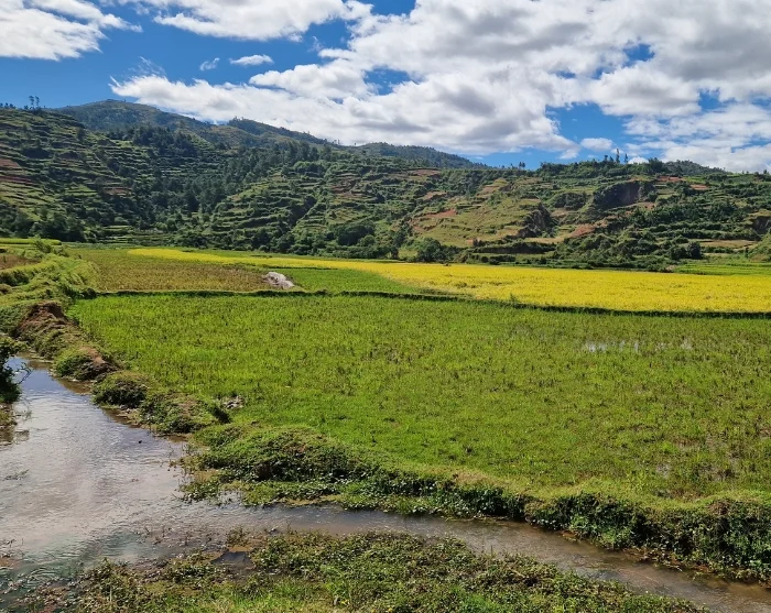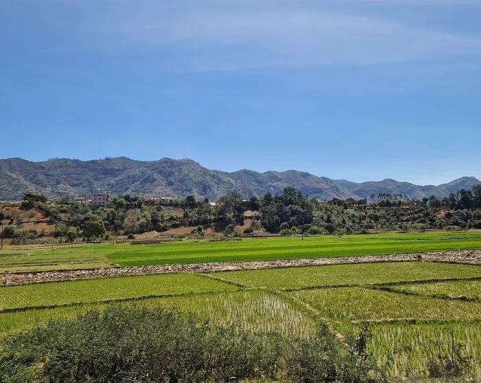 Misschien was het je gisteren al opgevallen: in het landschap zijn nauwelijks kale stukken grond te vinden. Zelfs dicht bij het centrum van Antananarivo zie je overal rijstvelden. Vandaag, terwijl je de stad achter je laat, wordt het alleen maar duidelijker: waar een stukje grond vrij is, wordt rijst verbouwd. Dat is niet voor niets – de bevolking van Madagaskar staat namelijk bekend om een van de hoogste rijstconsumpties ter wereld.
