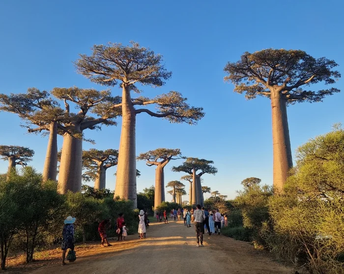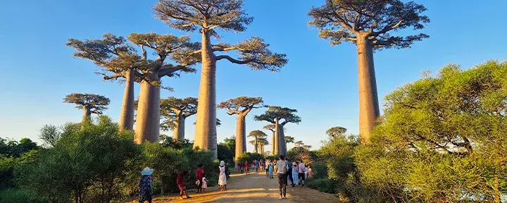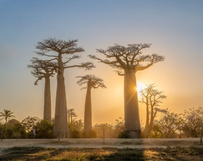 Na een onvergetelijke roadtrip door de steeds wisselende landschappen van Madagaskar, ontmoet u een ander wonder van de natuur: de imposante, eeuwenoude baobabbomen bij Morondava.