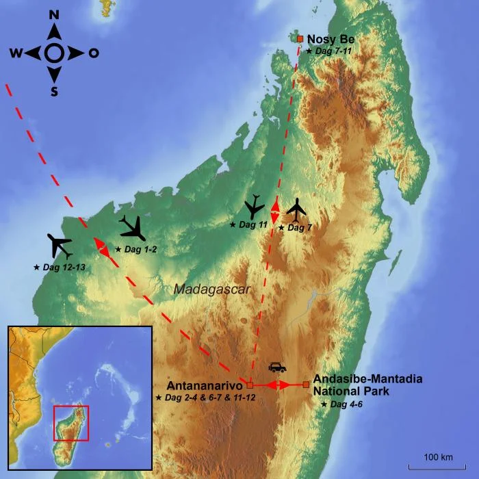 Ontdek de indrukwekkende landschappen en unieke dierenwereld van Madagaskar in Nationaal Park Andasibe-Mantadia, duik in de rijke geschiedenis van de hoofdstad Antananarivo en kom helemaal tot rust aan het turquoise water van het exotische tropische eiland Nosy Be.