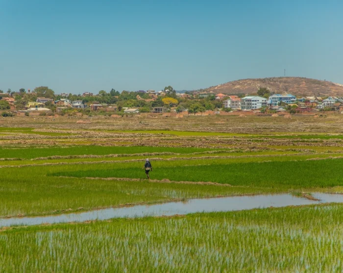 Zelfs voordat je de stadsgrens passeert, zie je de eerste rijstvelden opduiken. Ze worden verbouwd op vrijwel elk stukje beschikbare grond. Er wordt vaak gezegd dat de Malagassiërs tot de grootste rijsteters ter wereld behoren.