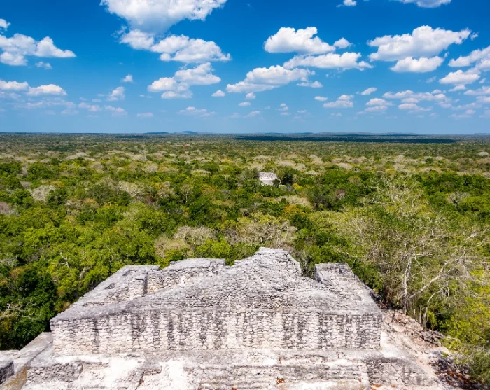 Na enkele uren rijden, dwars door kleine dorpjes en dicht tropisch groen, bereikt u het Calakmul Biosfeerreservaat—een uitgestrekt beschermd natuurgebied waar apen, toekans en zelfs jaguars leven. Hier ligt de oude Mayastad Calakmul, omhuld door een zee van dichte vegetatie.