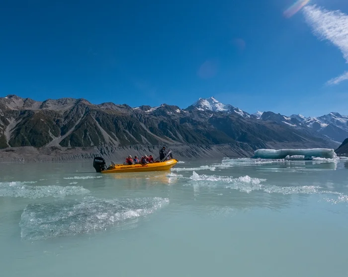 Met de boot krijgt u op een veilige manier toegang tot gebieden in het Nieuw-Zeelandse gletsjergebied die anders niet bereikbaar zijn.