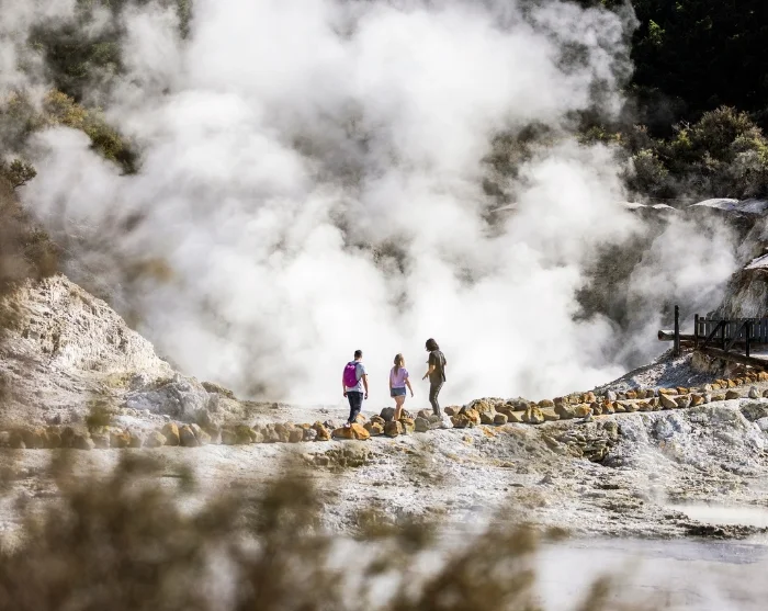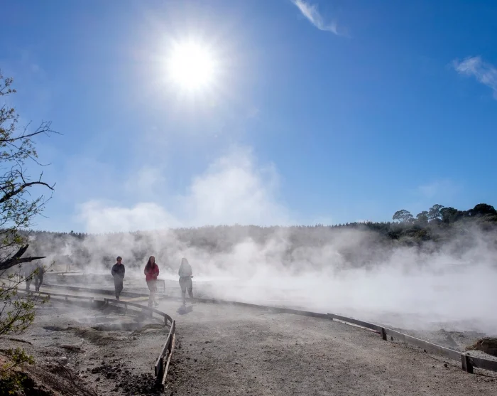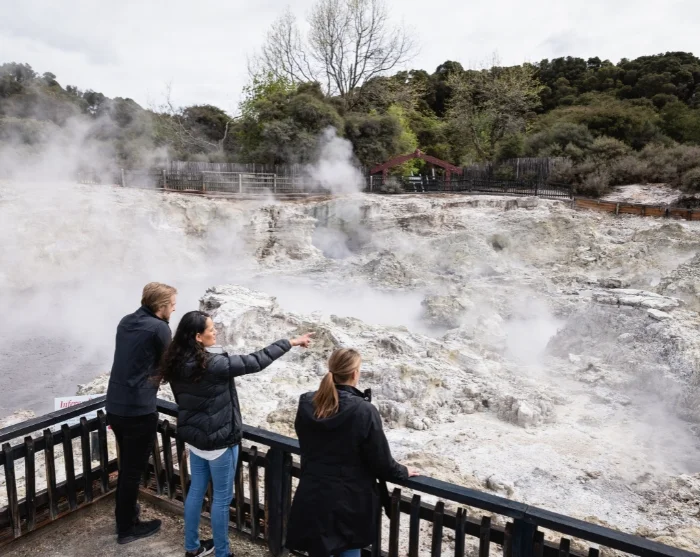 Na aankomst maak je een wandeling op eigen gelegenheid door het park, die ongeveer 1 tot 1,5 uur duurt. Je loopt door een fascinerend landschap van stomende zwavelbronnen, borrelende modderpoelen en kokende watervallen, omringd door de geur van zwavel, warme dampen en gekristalliseerde mineralen. Het pad is duidelijk gemarkeerd en gemakkelijk te volgen. Onderweg vind je informatieborden en uitkijkplatforms waar de bijzondere geologie van het gebied en de betekenis voor de Māori wordt uitgelegd.
