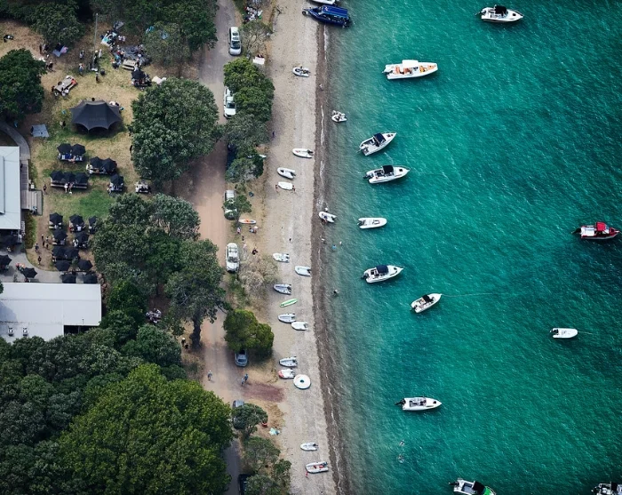 De reis begint bij Viaduct Harbour in Auckland, waar je de catamaranveerboot naar Waiheke Island neemt. De veerboottocht voert je door de pittoreske Hauraki Gulf, met uitzicht op eilanden en kustlijnen, voordat je aankomt bij Man O’ War Bay aan de oostkant van het eiland.