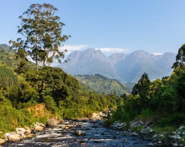 Vanaf de heuvelkam rond Kibale geniet je van een fenomenaal uitzicht over de zachte, groene heuvels met op de achtergrond het Rwenzori-gebergte.