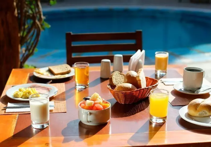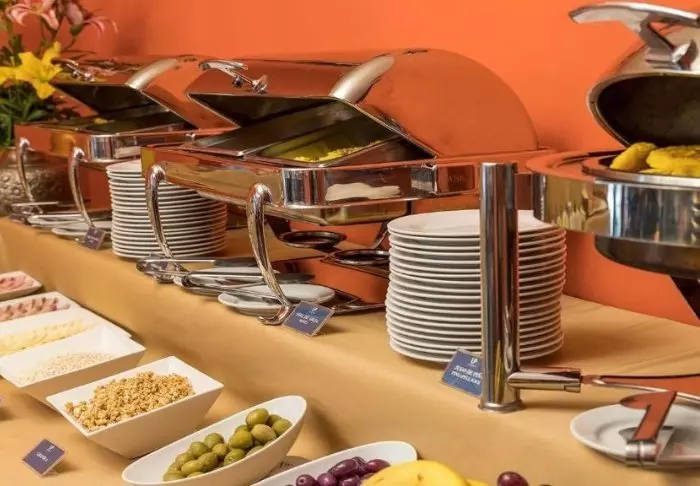 In het restaurant van het hotel kun je de dag beginnen met een ontbijt, dat is inbegrepen. Hier heb je de keuze uit ontbijtgranen, brood, kaas, ham, sap, enz.
