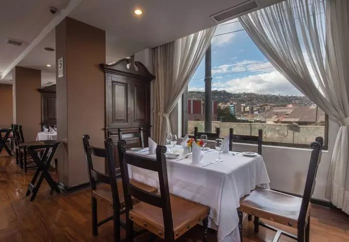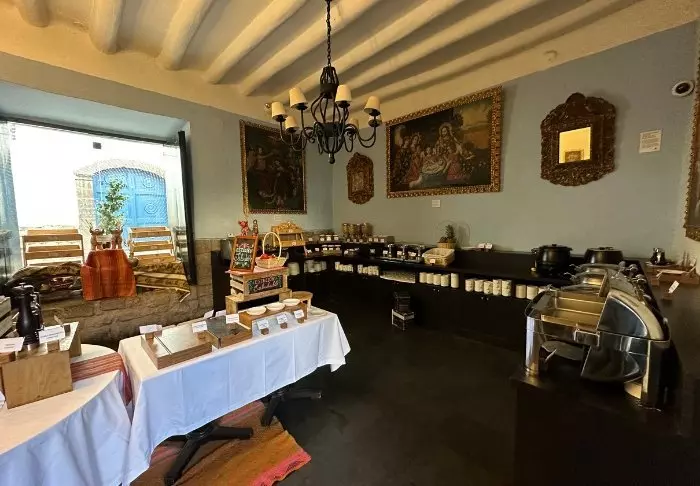 Je ontbijt (inbegrepen) wordt geserveerd als buffet in het hotelrestaurant, Taypicamaña, dat uitkijkt over het plein van de stad.