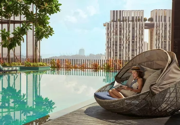 Oasia Downtown is een van de meer in het oog springende gebouwen die je tegenkomt in Singapore. Dit 27 verdiepingen tellende hotel met 314 kamers verrijst als een groene oase tussen alle andere grijze wolkenkrabbers, dus deze valt enorm op.