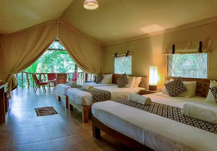 Het kamp bestaat uit luxe tenten die gekenmerkt worden door avontuur en ontspanning. Ze staan midden in de prachtige natuur. U wordt dus wakker met het geluid van fluitende vogels en het rustgevende stroompje van de rivier. De tenten zijn voorzien van echte bedden en een eigen badkamer met zowel koud als warm water. In uw tent vindt u ook gratis flessen mineraalwater en een waterkoker, zodat u zelf een kopje thee of koffie kunt zetten dat u op uw veranda kunt opdrinken. Een klamboe en föhn kunnen worden geleend bij de receptie en er is gratis wifi in de gemeenschappelijke ruimtes.