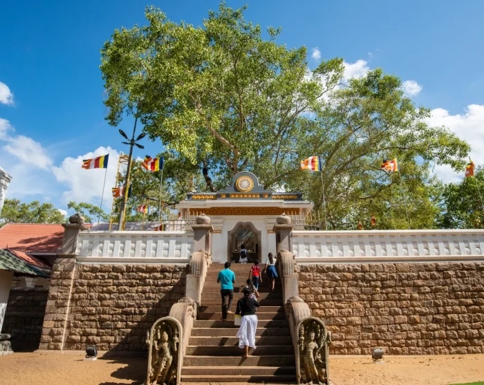 De reis begint bij de legendarische Sri Maha Bodhi-boom, ook wel bekend als de Verlichte Boom. Hier wordt u omringd door een indrukwekkende sfeer, tussen boeddhistische pelgrims en monniken in oranje gewaden die samenkomen om te bidden en offers te brengen bij deze heilige plek. Neem rustig de tijd om de bijzondere ambiance op te nemen en de kalmte en toewijding te ervaren die deze plek zo uniek maakt.