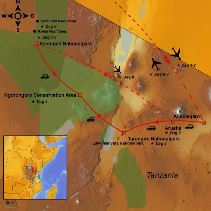 Het is tijd om afscheid te nemen van Serengeti en Tanzania. Je wordt naar centraal Serengeti gereden, vanwaar je naar Arusha vliegt. Hier word je opgewacht door een gids en naar Kilimanjaro International Airport gebracht, vanwaar je reis naar huis begint.