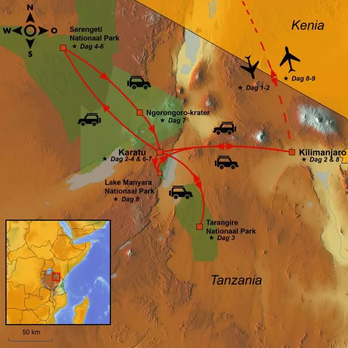 | Dag 8 | Lake Manyara ca. 25 km en naar Kilimanjaro Airport ca. 170 km | 195 |