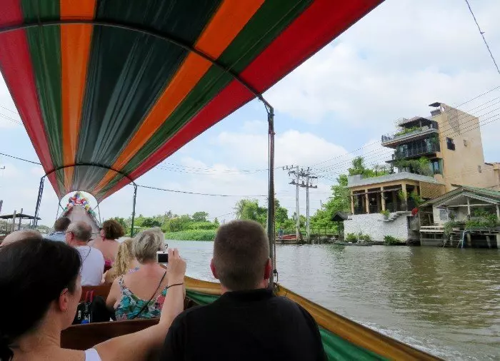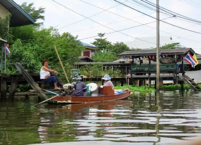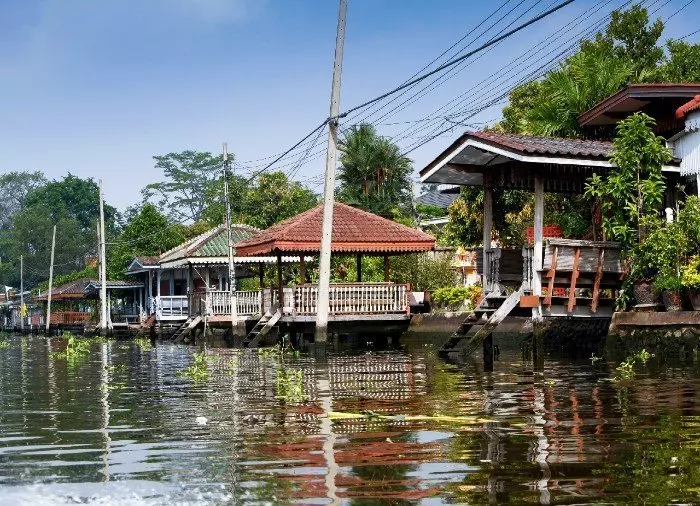 Vanaf hier loopt een klein stukje naar beneden, naar de Chao Phraya, de Rivier van de Koningen, waar u aan boord stapt van een langstaartboot. U wordt de wijk Thonburi, in het westen van Bangkok, binnengevaren via een doolhof van kanalen, ook wel ‘klongs’ genoemd. Vroeger vond het grootste deel van de dagelijkse handel in Bangkok plaats op en langs de kanalen, en wel in zo’n omvang dat de vroegere Europese handelsreizigers en andere bezoekers de stad ‘het Venetië van het Oosten’ noemden. De kanalen zijn nog steeds erg belangrijk voor de plaatselijke bevolking en stralen een mooie weelderigheid, rust en charme uit. Langs de kanalen staan huizen op palen, vanwaar kleine trappen naar het water leiden. U kunt hier mensen zien die hun haar aan het wassen zijn of hun kleding uitspoelen. Op de veranda’s ziet u vaak kleine kinderen met hun oma’s, die wachten op de boot van de postbode of van de ijsverkoper. Dit deel van Bangkok vormt een groot contrast met het centrale Bangkok, waar wolkenkrabbers, hoge spoorlijnen en snelwegen het beeld bepalen.