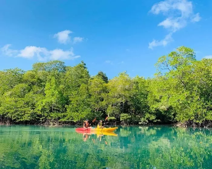 Rustig peddelen door de smalle wateren in de schaduw van de mangrovebomen is werkelijk geweldig. Luister naar de geluiden van de natuur en geniet van de wilde dieren die u ziet. Het mangrovebos is een broedplaats voor vogels en een belangrijk leefgebied voor vissen, garnalen, rivierkreeften, schaaldieren, slakken en slijkspringers. U komt waarschijnlijk ook makaken tegen, die goed gedijen in het mangrovebos.