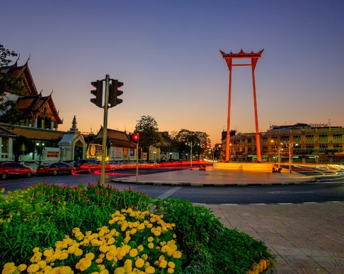 Terug in uw tuk-tuk passeert u de 27 meter hoge Giant Swing, een historisch en cultureel monument nabij de Wat Suthat Thepwararam tempel.