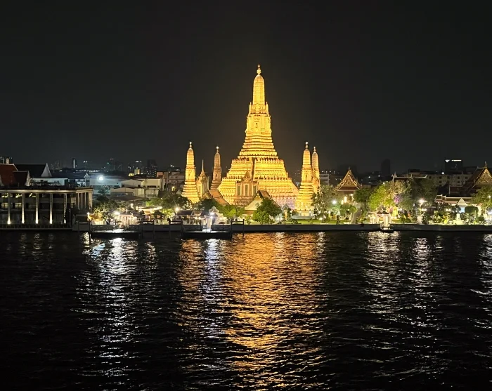 De avond wordt afgesloten op een ontspannen rooftop bar met uitzicht op de Chao Phraya rivier en de verlichte Wat Arun tempel. Het uitzicht kan niet mooier!